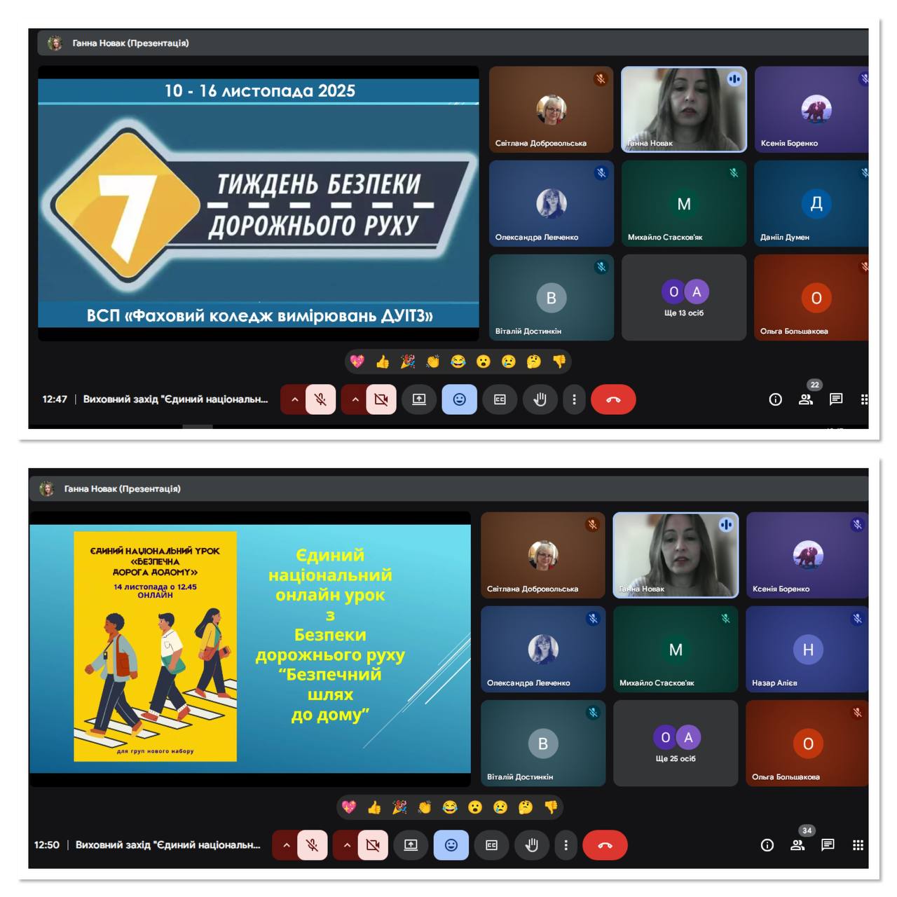 У період з 10 по 16 листопада 2025 року в Україні відбувся другий етап щорічного Тижня безпеки дорожнього руху. Відповідно листа Міністерства освіти і науки України від 27.08.2025 1/177755-25 «Про проведення Заходів з безпеки дорожнього руху» у ВСП «Фаховий коледж вимірювань ДУІТЗ» було організовано заходи, спрямовані на попередження дитячого дорожньо-транспортного травматизму, зокрема 14 листопада 2025 року викладачем Ганною Новак проведено єдиний національний урок «Безпечна дорога додому».