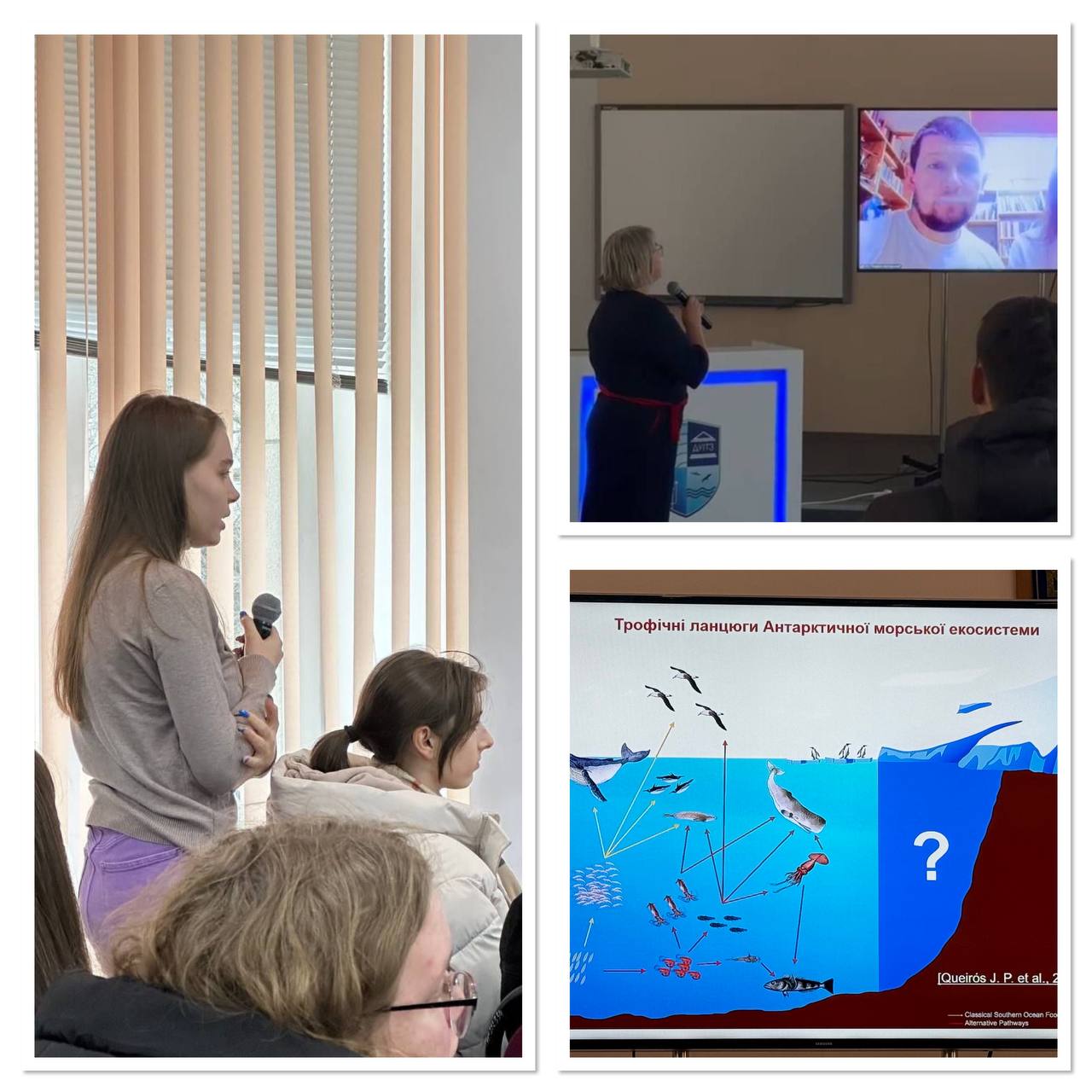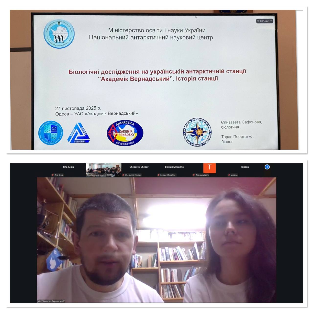 Учасники зустрілись із українськими науковцями, які зараз працюють на станції «Академік Вернадський», розташованій на мисі Марина острова Галіндез, що в Антарктиці. Учасники 30 української антарктичної експедиції – мікробіолог Тарас Перетятко та біологиня Єлизавета Сафонова – розповіли про флору та фауну такого далекого від України куточка світу, про біологічні дослідження, які проводять на УАС “Академік Вернадський”, продемонстрували фото та відео, відзняті українськими науковцями. Пані Єлизавета показала місцевих жителів – справжніх пінгвінів. Усі змогли побачити справжню антарктичну весну та поставити запитання вченим.