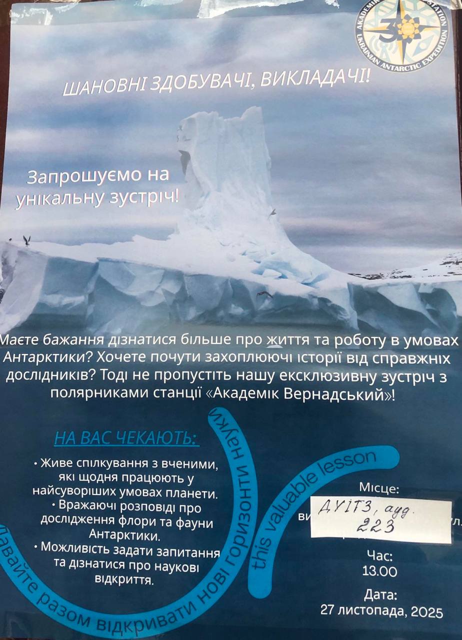 Наприкінці листопада здобувачі освіти та викладачі ВСП «Фаховий коледж вимірювань ДУІТЗ» та Державного університету інтелектуальних технологій і зв’язку мали унікальну можливість здійснити онлайн-мандрівку на найбільш засніжену частину нашої планети – Антарктику.