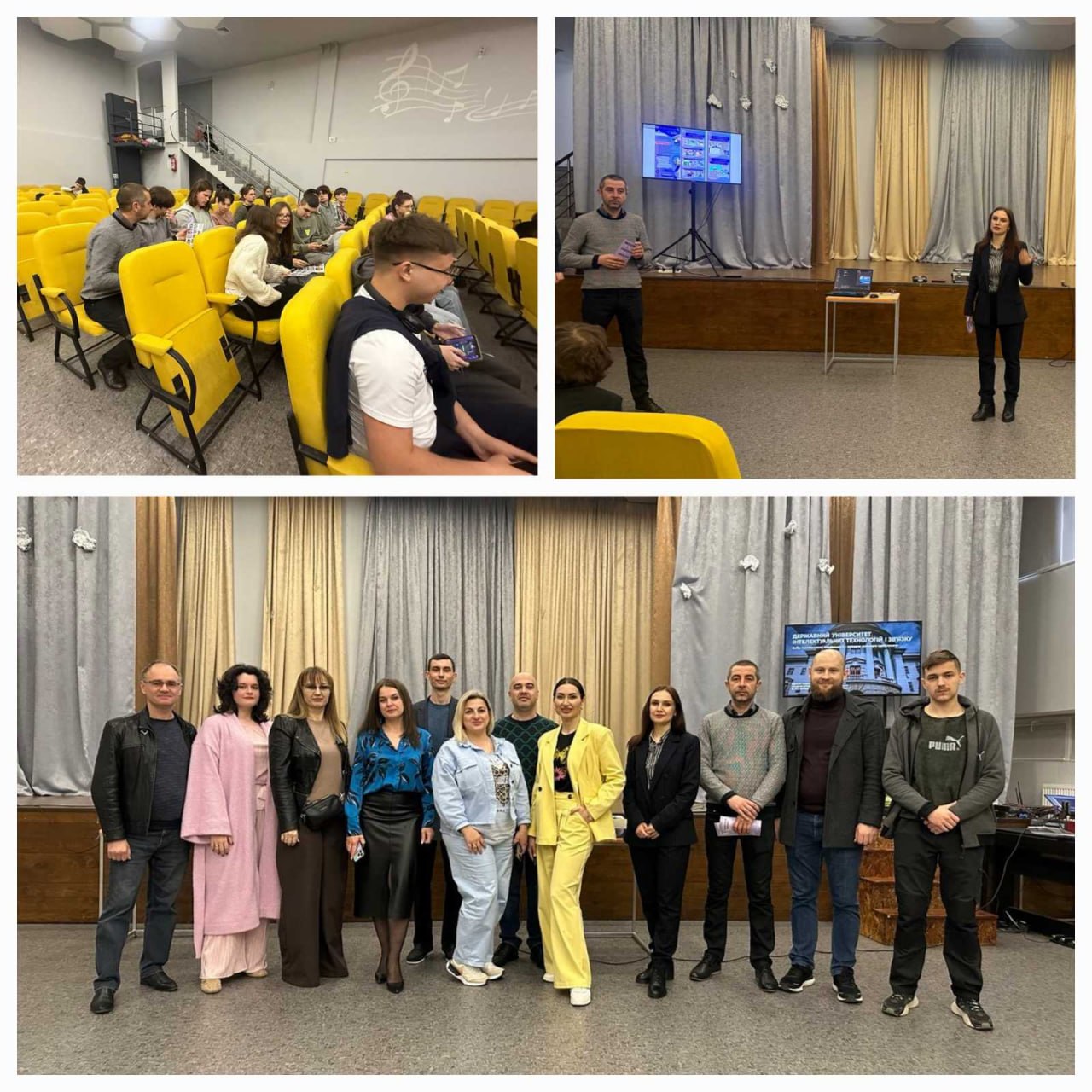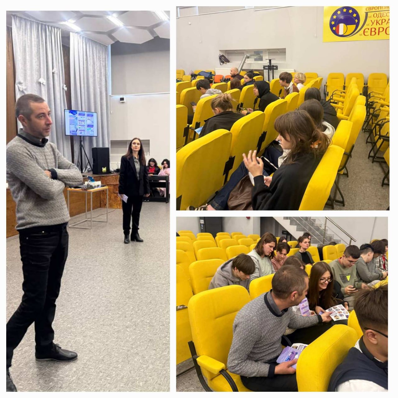 24 квітня 2026 року директор ВСП “Фаховий коледж вимірювань ДУІТЗ» Інна ШЕВЕЛЬОВА та завідувач спеціальної лабораторії технічних засобів навчання, викладач вищої категорії Антон РОЗМАРИЦЯ спільно із представниками Державного університету інтелектуальних технологій і зв’язку провели профорієнтаційну зустріч з учнями Одеського ліцею «Європейський». Захід відбувся у форматі живого спілкування та інтерактивної презентації, що дозволило школярам ближче познайомитися з можливостями навчання та перспективами майбутньої професії.
